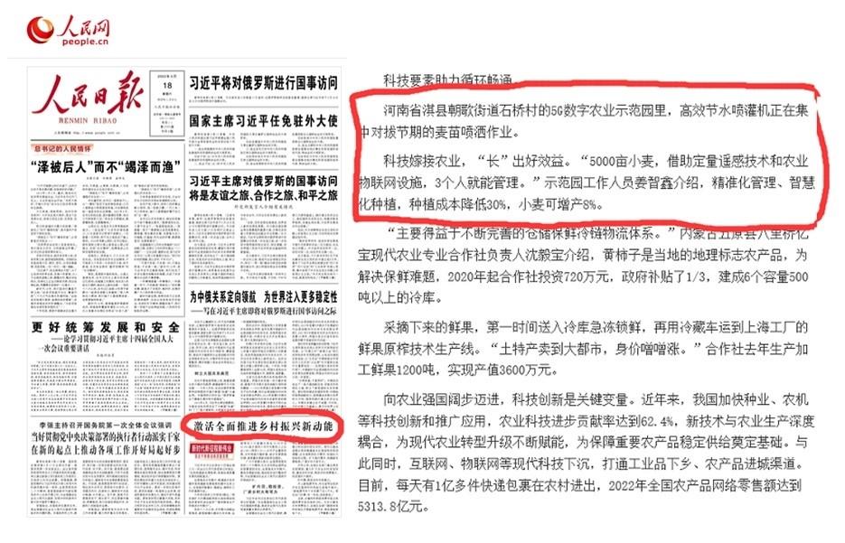 近日,物理所子公司河南省現(xiàn)代農(nóng)業(yè)大數(shù)據(jù)產(chǎn)業(yè)技術(shù)研究院有限公司5G數(shù)字農(nóng)業(yè)示范園被人民日?qǐng)?bào)頭版、人民網(wǎng)、河南日?qǐng)?bào)等媒體相繼報(bào)道。