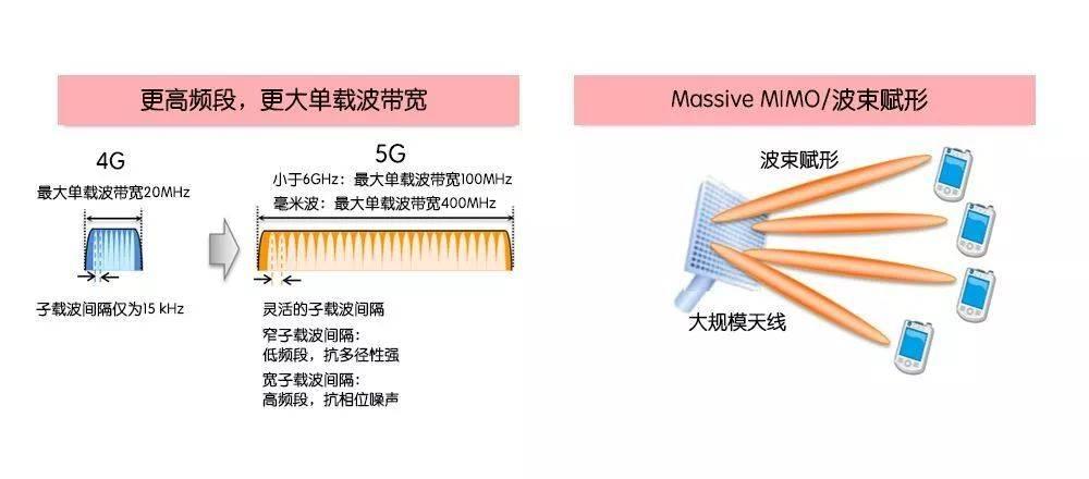 在速率上,5G主要依靠增大單載波帶寬提升,并通過Massive MIMO技術(shù)進(jìn)一步提升網(wǎng)速和增強(qiáng)覆蓋。